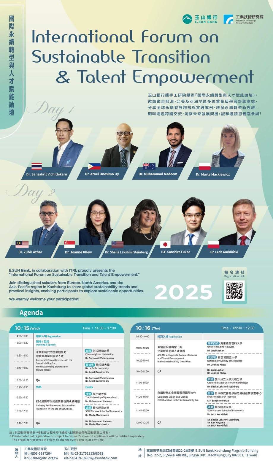 誠摯邀請您參加【國際永續轉型與人才賦能論壇】,活動將於2025年10月15日(三)與10月16日(四)分別舉辦兩場論壇於高雄市苓雅區四維四路22-2號5樓辦理,敬邀關心永續轉型與人才賦能發展的產業先進蒞臨指導。