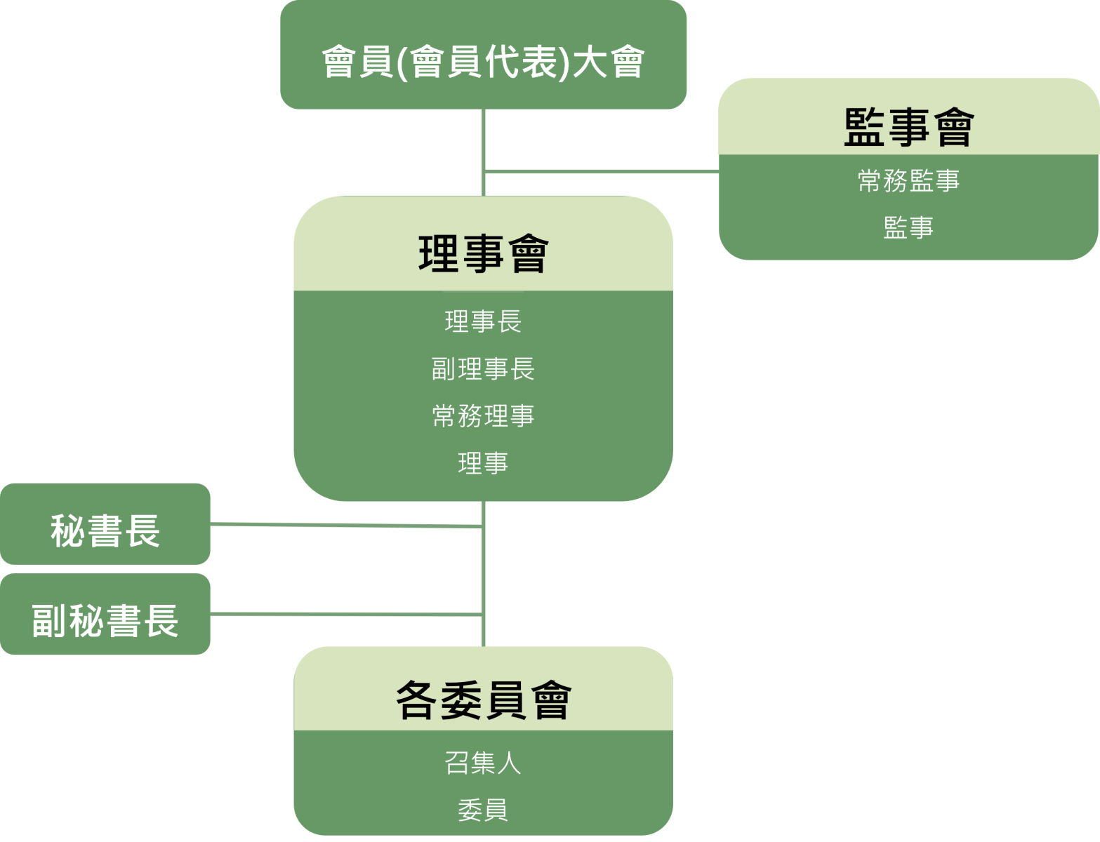 本會以會員(會員代表)大會為最高權力機構,理監事會成員皆由會員(會員代表)選舉之,理事會共設22人,包含理事長1位、常務理事7位及理事14位,